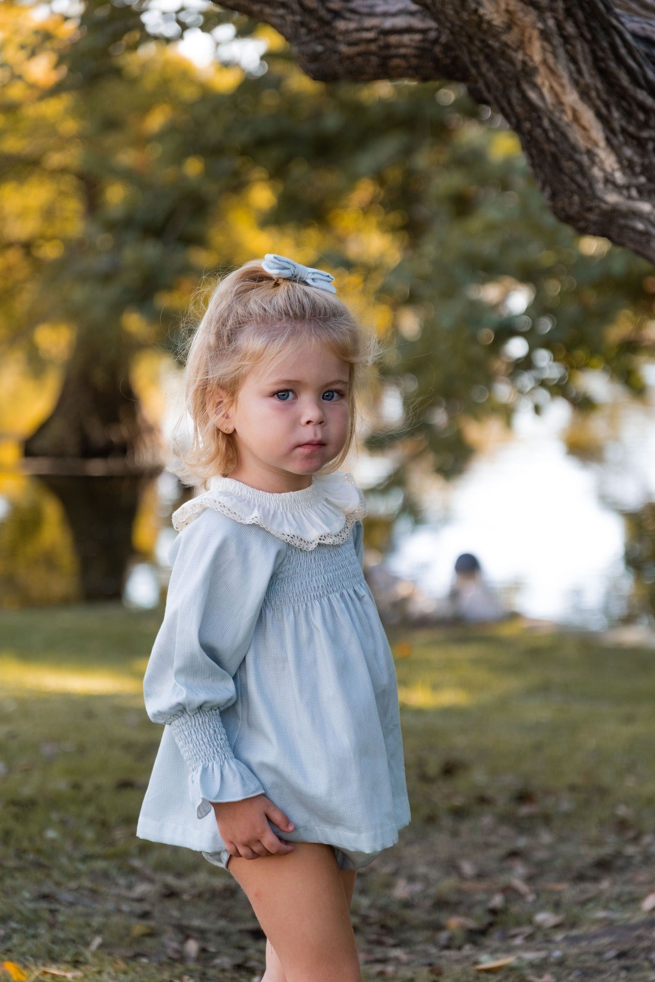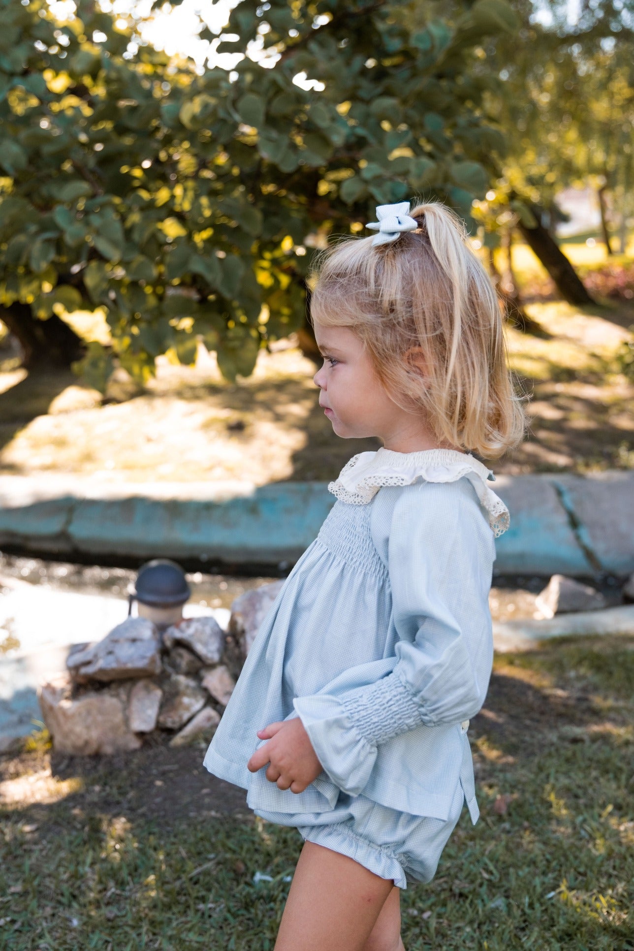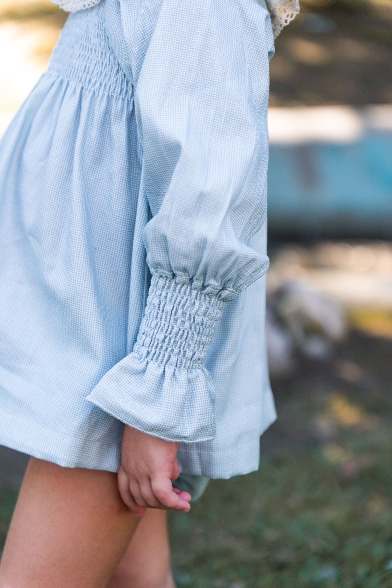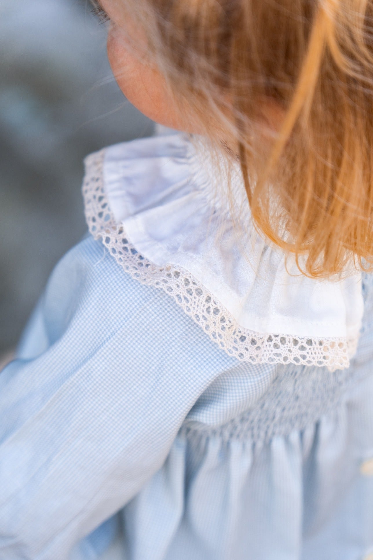 Jesusito con nido de abeja en el pecho y en el cuello. Encaje de guipur decorando el cuello. Tejido 100% algodón. Incluye braguita.